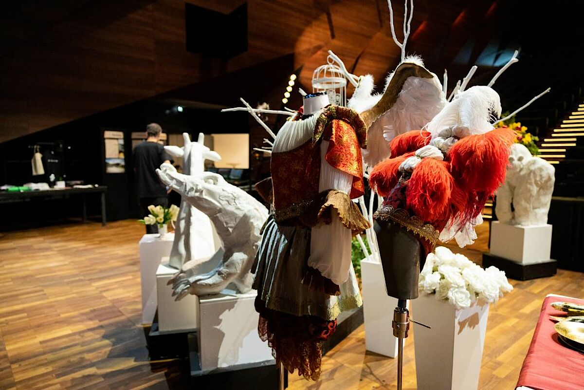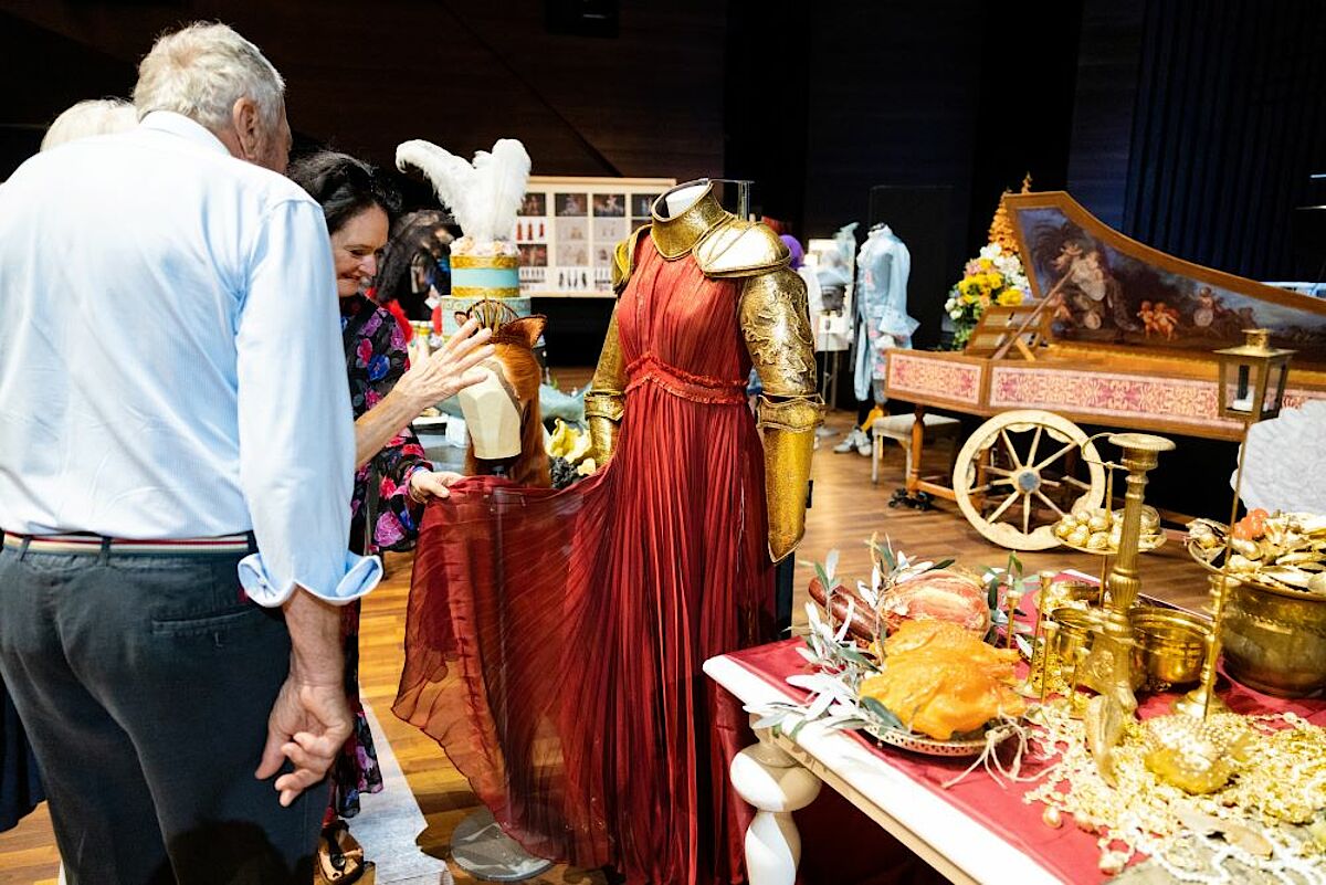 The visitors, including numerous children, were not a little amazed when they saw the impressive scenery of the opera "Königskinder" up close for the first time. A floor covered with "artificial snow", trees made of real wood and a caravan wreck in a winter scene presented a stark contrast to the June heat outside. Just below, in the raised orchestra pit, our costume manufactory and our technical department had exhibited their most beautiful creations for interested visitors. Many visitors took advantage of the opportunity to see such detailed costumes, wigs and scenery from the first minute. Our staff were open to all their questions.
