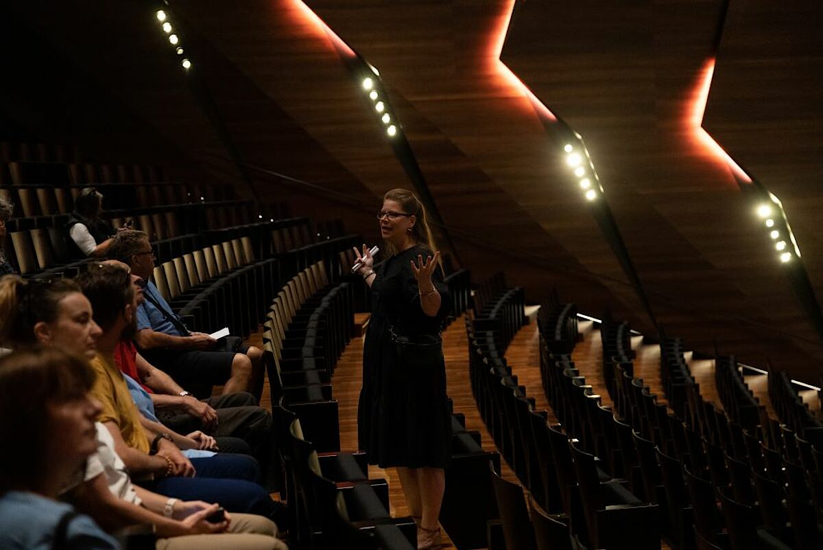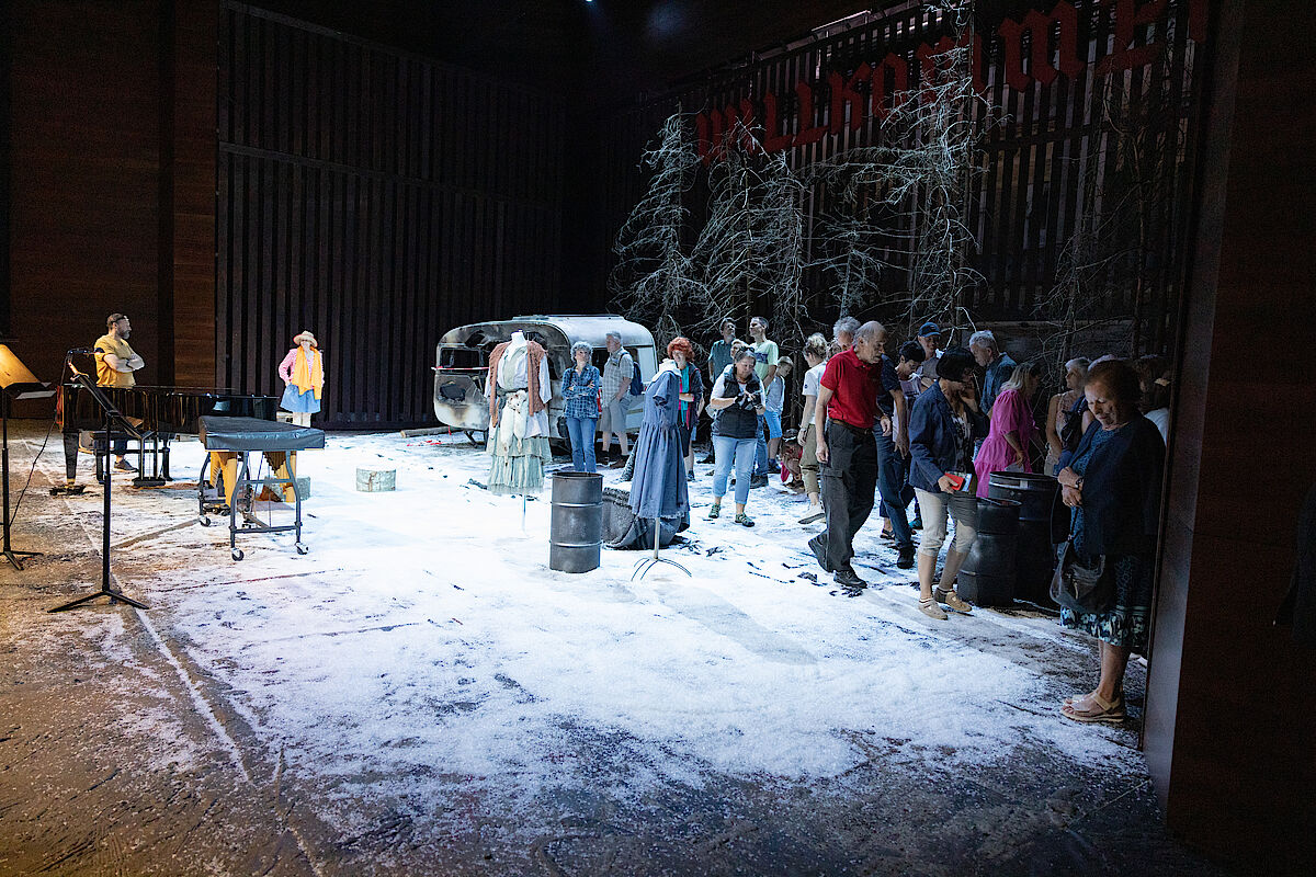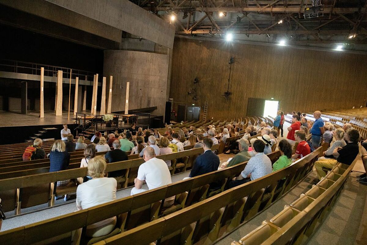 The 45-minute guided tours, which took place every half hour, were also very well attended: Here, interested visitors could not only view the stage with scenery, but also get a glimpse into the technical and administrative departments of our Festspielhaus. Live on site: Director Brigitte Fassbaender spontaneously opened the Passion Play House on her own initiative, where rehearsals for Richard Wagner's "Siegfried" and "Götterdämmerung" are currently taking place. Interested visitors could thus look over Fassbaender's team's shoulders and in the afternoon take part in an organized tour of the Passion Play House.